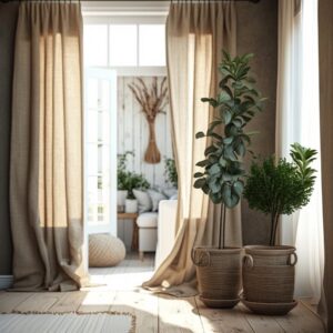 - Textured curtains with a natural look and feel, such as burlap, linen, or woven wood. These materials add depth and warmth to the room.